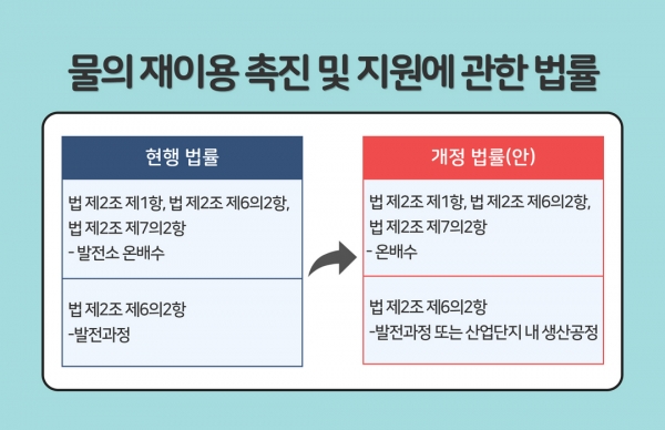 그러나 현행‘물의 재이용 촉진 및 지원에 관한 법률’에는 “온배수 재이용사업”을 “발전소 온배수를 재이용할 수 있도록 처리된 물”로 한정하고 있어 법률 개정이 필요한 사항이다.