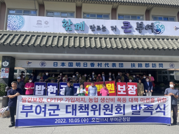 부여 농업인단체, 농협조합장 등은 지난 5일 ‘쌀값 보장, CPTPP가입 저지, 농업생산비 폭등 대책 마련을 위한 부여군 대책위원회’ 발족식을 부여군청에서 개최했다.