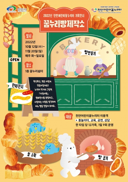 [Ytv영상스토리] 천안어린이꿈누리터(관장 조혜순)는 오는 9일부터 10일까지 열리는 ‘2022 빵빵데이 천안’ 축제 개최를 기념해 꿈누리터 이용자들을 대상으로 기획전시 ‘꿈누리빵제작소’를 10월 12일부터 11월 20일까지 진행한다.