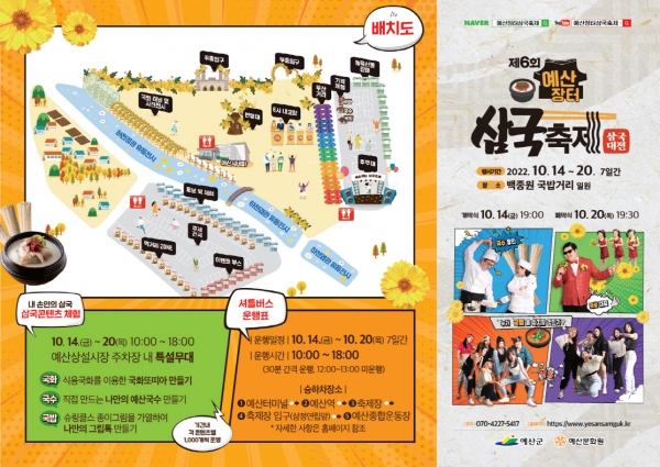 [Ytv영상스토리] 예산군이 ‘제6회 예산장터 삼국축제’를 오는 10월 14일부터 20일까지 예산전통시장 백종원 국밥거리 일원에서 개최한다.