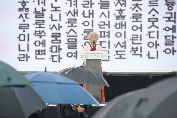 특히 경축식에서는 늦은 나이에 한글을 배우고 계신 양정자씨가 훈민정음 머리글을 읽으면서 한글날의 의미를 더했다.