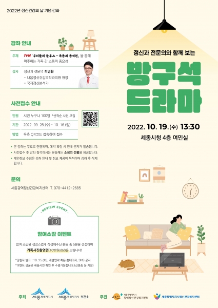 [Ytv영상스토리] 세종특별자치시광역정신건강복지센터와 세종특별자치시정신건강복지센터가 공동으로 오는 19일 오후 1시 30분 시청 여민실에서 ‘정신건강의 날’을 기념해 정신건강 시민강좌 ‘정신과 전문의와 함께 보는 방구석 드라마’를 진행한다.