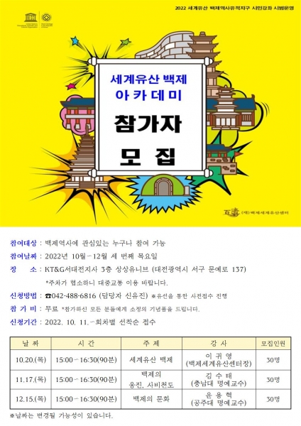 [Ytv영상스토리] 백제세계유산센터가 세계유산 백제역사유적지구 및 백제의 역사와 문화를 주제로 오는 12월까지 월 1회 ‘세계유산 백제 아카데미’를 운영한다.
