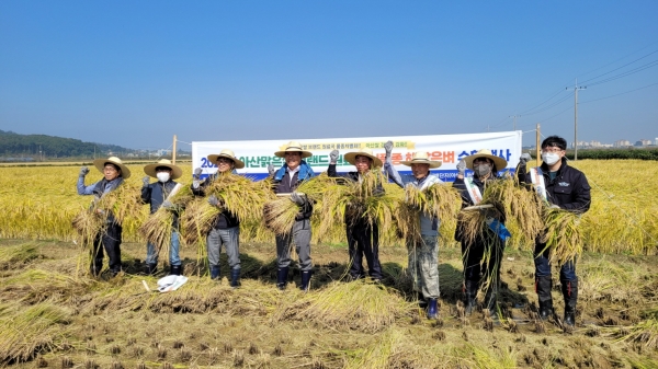 수확 행사는 농업기술센터소장, 둔포·영인농협조합장, 해맑은벼 계약재배 농가 등 30여명이 참석한 가운데 둔포면 신법리 들녘에서 열렸다.
