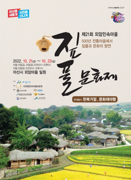 아산시와 외암민속마을보존회에 따르면 제21회 외암민속마을 짚풀문화제를 오는 21일부터 23일까지 개최한다고 밝혔다.