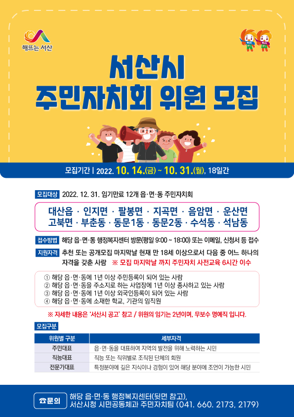 17일 시에 따르면 이번 모집 대상은 올해 임기가 만료되는 12개 읍·면·동의 주민자치회 위원으로 대산읍, 인지면, 팔봉면, 지곡면, 음암면, 운산면, 고북면, 부춘동, 동문1동, 동문2동, 수석동, 석남동이다.