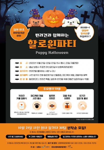 [Ytv영상스토리] 보령시는 오는 21일부터 22일까지 이틀간 보령축제관광재단 머드사업국에서 반려동물과 함께하는 반려견 할로윈 파티를 개최한다고 밝혔다.