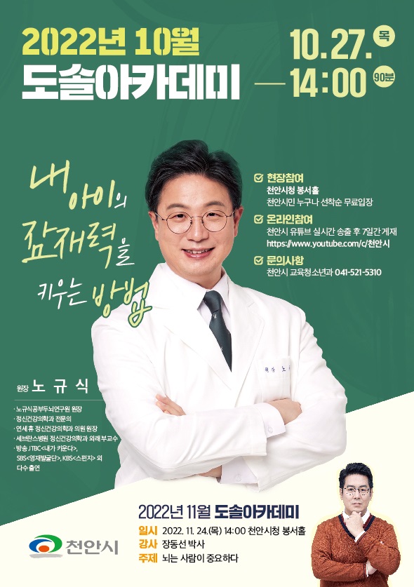 [Ytv영상스토리] 천안시는 오는 27일 오후 2시 ‘내 아이의 잠재력을 키우는 방법’이라는 주제로 정신건강의학과 전문의 노규식 박사를 초청해 10월 도솔아카데미 강연을 진행한다.
