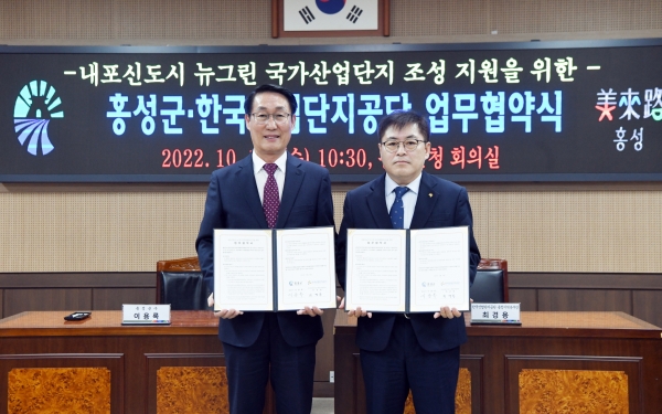 [Ytv영상스토리] 홍성군은 지난 19일 홍성군청에서 한국산업단지공단 충청지역본부와 ‘내포신도시 뉴그린 국가산업단지’조성을 위한 상호 협력 협약을 체결했다.