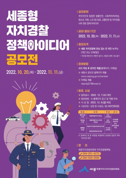 세종자치경찰위원회 관계자는 “전 국민을 대상으로 세종형 자치경찰 정책 아이디어를 발굴하고 이를 반영하기 위해 이번 공모전을 마련했다”며 “많은 관심과 신청 부탁드린다”고 말했다.