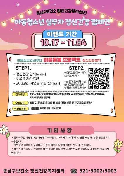 동남구 지역 학교 학생상담 담당자, 사회복지기관 담당자, 지역아동센터 실무자 등 아동·청소년 관련 실무자를 대상으로 하는 정신건강 캠페인은 실무자들의 정신건강 방역을 위해 정신건강 인식도 조사, 우울증 자가검진, 2023년 사업을 위한 실태조사를 실시한다.