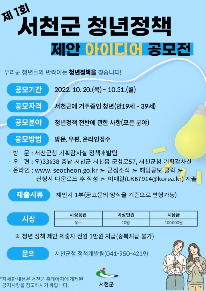 서천군에 거주하는 청년이라면 누구나 응모 가능하며 청년정책 전반에 관한 무엇이든 제안할 수 있다.