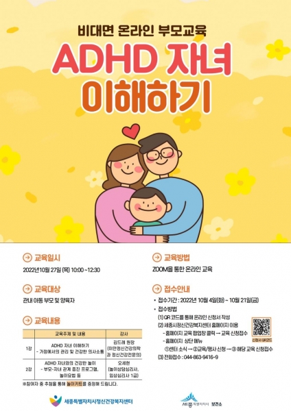 이번 강좌는 ‘주의력결핍과잉행동장애 자녀 이해하기’로 온라인 교육으로 소아청소년정신과 전문의와 놀이상담심리사를 통해 약 2시간 30분 동안 진행된다.