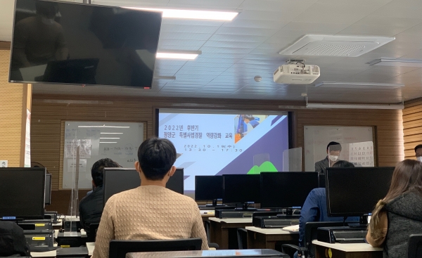 군은 지난 19일 서울시 민생사법경찰단 수사자문위원을 초빙해 분야별 단속 방법과 현장 수사 실무, 신문 방법, 조서 기재례, 수사 인권 등 업무 전반에 대한 강의를 들었다.