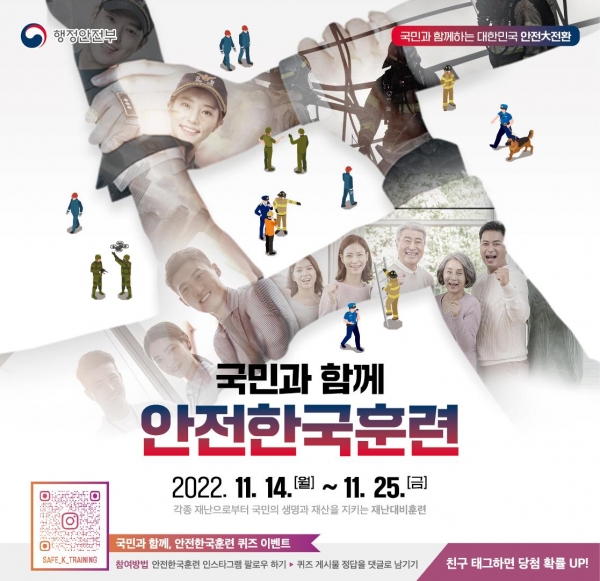 한편 올해 서천군 안전한국훈련은 11월 14일부터 24일까지 서천군, 서천소방서 서천경찰서 등 관계기관·단체가 참여해 지진·다중밀집시설 붕괴사고를 가정한 대응훈련을 실시할 계획이라고 전했다.