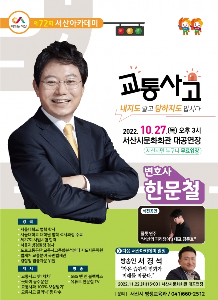 [Ytv영상스토리] 충남 서산시는 오는 10월 27일 오후 3시에 문화회관 대공연장에서 한문철 변호사를 초청해 ‘제72회 서산아카데미’를 개최한다고 24일 밝혔다.