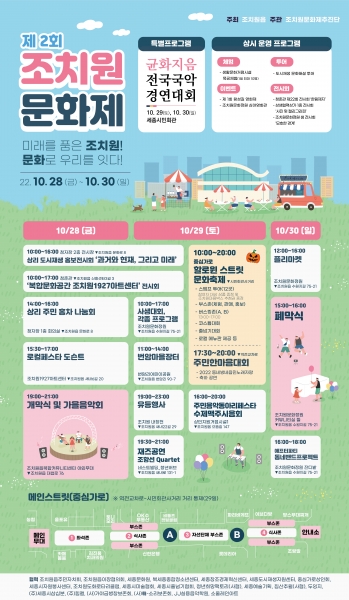 균화지음 전국국악경연대회 청자장 홍차 시음회 생활문화거점시설 목공체험 번암리 마을투어 도시재생 문화해설투어 조치원문화정원 심야영화관 청춘관 제22회 전시회 ‘한림제지’ 상생협력상가 전시회 등이 열려 다양한 볼거리를 제공할 계획이라고 전했다.
