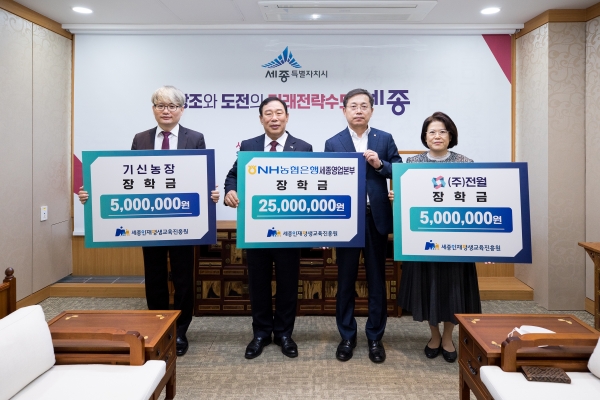최민호 시장은 “경기침체 장기화로 어려운 여건에서도 세종시의 장학 사업에 지속적인 관심과 후원에 감사드리며 기업 이익을 지역사회에 환원하고자 노력해 주시는 마음을 잊지 않겠다”며 “지역의 학생들이 기부금을 발판 삼아 꿈을 키워 나갈 수 있도록 더욱 노력하겠다”고 말했다.