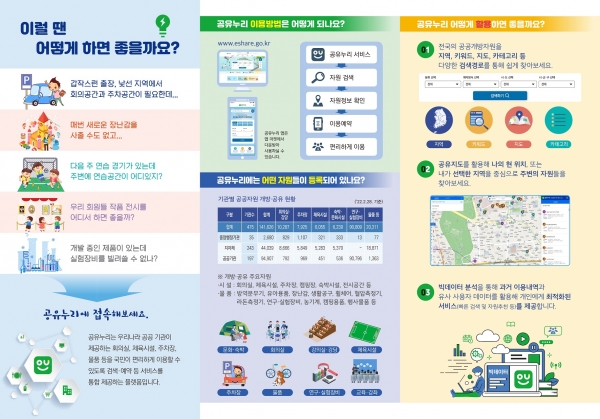 ‘공유누리’에는 회의실, 체육시설, 주차장, 숙박시설 등의 자원이 등록되어 있으며 시민은 인터넷 포탈 ‘공유누리’에 접속하거나 공유누리 앱을 설치해 공공자원을 이용신청 할 수 있다.