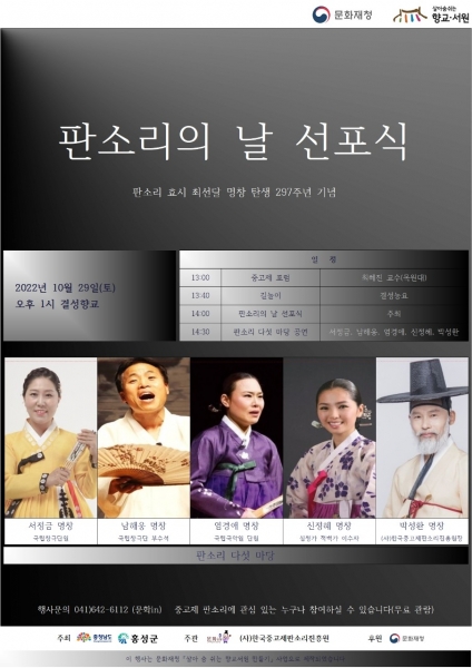 [Ytv영상스토리] 홍성군은 판소리 효시 최선달 명창 탄생 297주년 기념 ‘판소리의 날 선포식’행사가 오는 10월 29일 오후 1시 결성향교에서 개최된다.