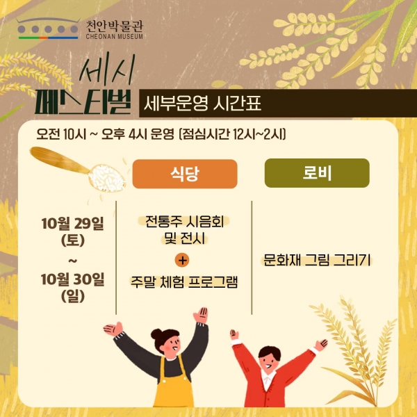 이번 행사는 자녀를 둔 천안시민을 대상으로 박물관 로비, 식당, 야외공연장, 초가, 와가 등 장소와 어울리는 세시풍속 관련 다양한 체험과 문화예술 행사로 치러진다.