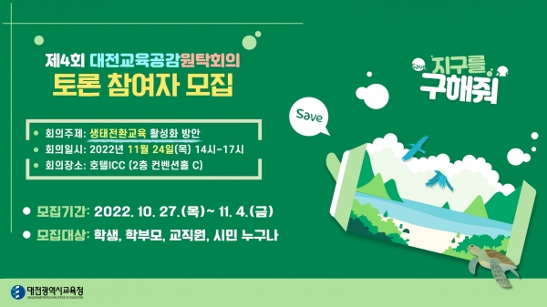 [Ytv영상스토리] 대전광역시교육청은 11월 24일 오후 2시에 호텔 ICC에서 ‘생태전환교육 활성화 방안’이라는 주제로 개최되는‘2022년 제4회 대전교육공감원탁회의’에 참여할 토론 참여자를 모집한다고 밝혔다.
