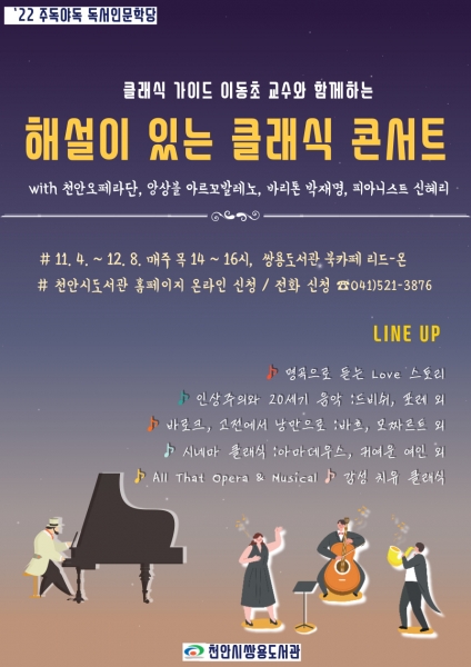 하반기 프로그램인 ‘클래식 가이드 이동초 교수와 함께하는 해설이 있는 클래식 콘서트’는 평택대학교 음악학부 교수이자 천안오페라단장인 이동초 교수와 함께 오페라, 뮤지컬, 피아노, 재즈 등을 감상하며 예술적 지식과 감성을 깨울 수 있다.