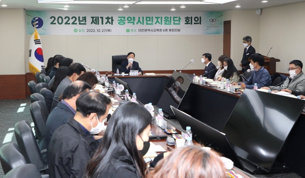 [Ytv영상스토리] 대전광역시교육청은 10월 27일 오후 2시 30분 시교육청 중회의실에서 2022년 제1차 공약시민지원단 회의를 개최해 제3기 공약시민지원단 단장과 부단장을 선출하고 제11대 교육감 공약 실행계획안에 대한 자문을 청취했다.