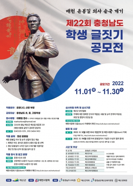 예산군이 주최하고 매헌사랑회가 주관하는 이번 공모전은 청소년들에게 윤 의사의 나라 사랑 정신을 기리고 상해의거를 기념하기 위해 마련됐으며 ‘청년 윤봉길’을 주제로 운문과 산문으로 나눠 실시되고 충남도 초·중·고 학생 누구나 지원할 수 있다.