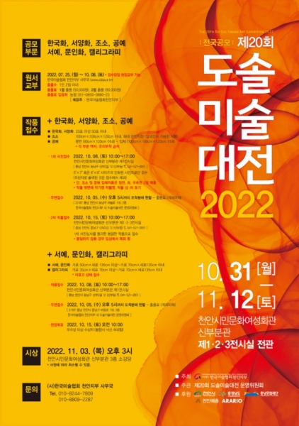 1부와 2부로 나뉘어 진행되는 제20회 도솔미술대전은 1부 10월 31일부터 11월 5일까지는 한국화, 서양화, 조소, 공예 부문 작품을 전시하고 2부 11월 6일부터 12일까지는 서예, 문인화, 캘리그라피 부문 작품을 선보인다.