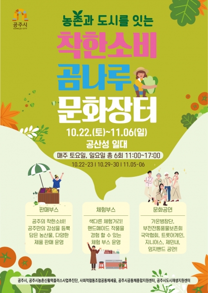 ‘착한소비 공유장터’는 공주시 농촌 신활력플러스사업의 일환으로 지역 생산물 판로를 지원해 농업·농촌종사인구 및 소상공인의 내수 발전을 촉진하기 위한 공동 판매시설을 조성하는 사업이다.