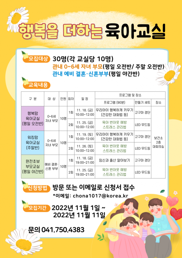 자녀를 둔 부모를 대상으로 운영되는 행복맘·워킹맘 육아교실에서는 우리아이 행복하게 키우기를 교육하며 예비 결혼·신혼 부부 대상의 완전초보 부모교실에서는 임신과 출산 알아보기 강의가 준비됐다.