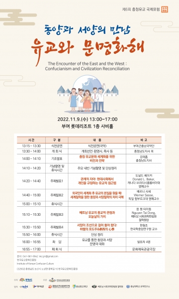 2017년 시작해 올해 6회째를 맞는 충청유교 국제포럼은 충청 유교문화의 역사적 위상과 학술적 가치를 조명해 대내외에 널리 알리고 국외 유교문화를 국내 유림과 일반시민에게 소개하는 학술 포럼이다.