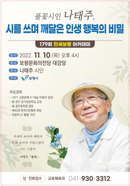 [Ytv영상스토리] 보령시는 오는 10일 오후 4시 보령문화의전당 대강당에서 시인 나태주를 초빙해 ‘시를 쓰며 깨달은 인생 행복의 비밀’이라는 주제로 제179회 만세보령 아카데미 강연을 개최한다고 밝혔다.