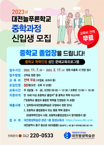 교육비는 전액 무료이며 ‘대전늘푸른학교’입학 희망자는 대전평생학습관 1층 평생교육과에 직접 방문해 관련 증명서와 함께 입학원서를 제출하면 된다.