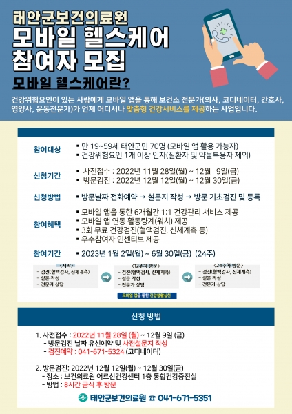 모바일 헬스케어는 건강위험 요인이 있는 주민을 대상으로 스마트폰 앱을 활용해 의사·코디네이터·간호사·영양사·운동처방사 등 보건의료원 전문가가 1:1 맞춤형 건강상담 등을 비대면으로 제공하는 사업이다.