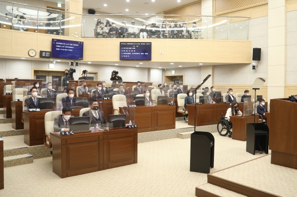 제79회 정례회 1차 본회의에서는 유인호·김동빈·김재형·여미전·김충식 의원의 5분 자유발언에 이어 내년도 본예산안 제출에 따른 시정연설 등 8개 안건을 처리했다.