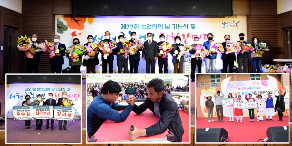 이날 오전 행사는 지역농업 발전에 힘쓴 27명의 우수농업인 시상, 6개 지역농협 조합장에게 취약계층 대상 벼 병해충 방제에 대한 감사패가 전달, ‘농업가치 실천 확산’ 다짐 등 기념식이 열렸다.