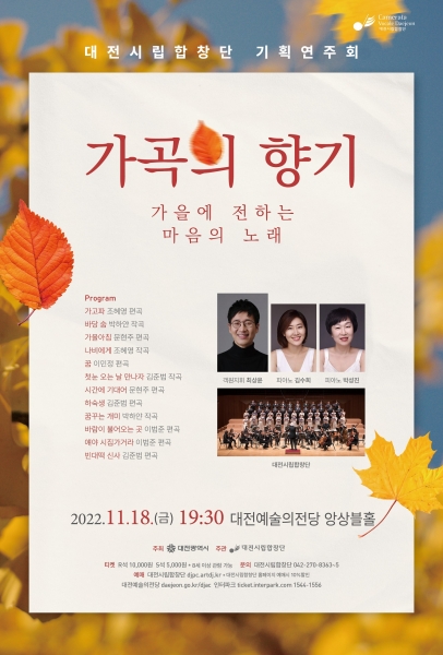 ‘가을에 전하는 마음의 노래’를 부제로 하는 이번 연주는 제주특별자치도립 서귀포합창단 상임지휘자 최상윤의 객원지휘와 대전시립합창단의 하모니로 가을의 절정인 11월에 어울리는 우리 가곡의 아름다움을 선보일 예정이다.
