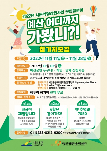 2022년 예산군 군민팸투어는 ‘예산 어디까지 가봤니?’를 주제로 지금이 제철이다 6학년 같이가자 옛 추억의 7080 총 3가지 코스로 구성된다.