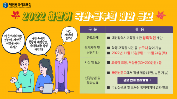 [Ytv영상스토리] 대전광역시교육청은 오는 11월 15일~11월 24일까지 학생·시민·공무원 등 전 국민을 대상으로 2022년 하반기 국민·공무원 제안 공모를 실시한다고 밝혔다.