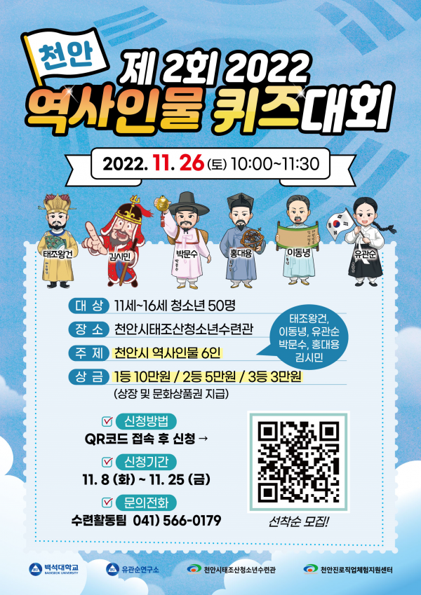 청소년들이 지역 역사에 흥미를 가지고 애향심과 올바른 국가관, 가치관을 확립할 수 있도록 마련된 이번 퀴즈대회는 천안의 대표적인 인물 유관순을 비롯해 이동녕, 박문수, 홍대용, 김시민, 태조왕건까지 천안역사인물 6인을 주제로 진행한다.