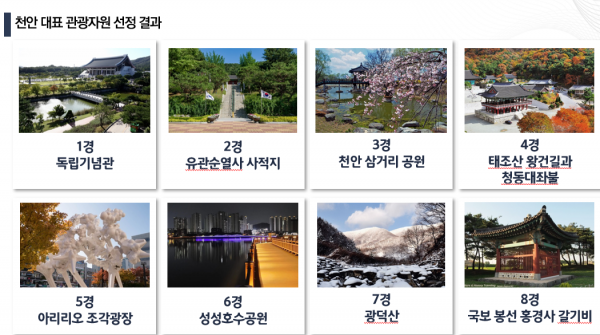독립기념관과 유관순열사사적지는 우리나라 독립운동의 역사를 간직하고 기록한 민족의 성지로 ‘천안은 애국충절의 고장’이라는 자긍심과 시민정신을 드높이는 관광자원으로 평가받아 1경과 2경으로 각각 선정됐다.