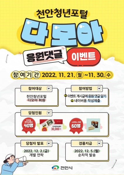청년들이 ‘다모아’를 알고 정보를 공유할 수 있도록 마련된 이번 이벤트는 다모아 이벤트 게시글에 천안청년포털과 청년들에게 보내는 응원 댓글을 달아 신청하면 참여할 수 있다.