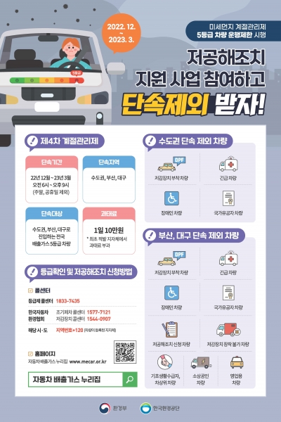 배출가스 5등급 차량 수도권, 부산, 대구 등 운행 제한 단속 확대, 노후 경유차 조기 폐차 지원사업, 운행차 저공해 조치 사업 등을 현수막과 리플렛을 활용해 안내했다.