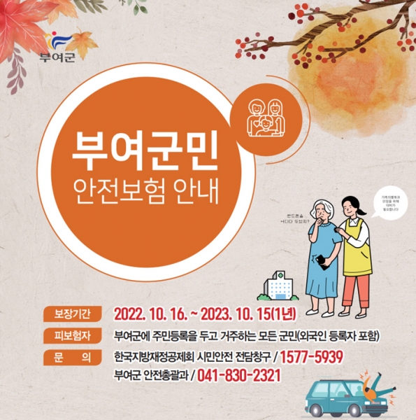 군민안전보험 3종은 부여군에 주민등록을 둔 모든 군민으로 별도 가입 절차 없이 자동으로 가입된다.