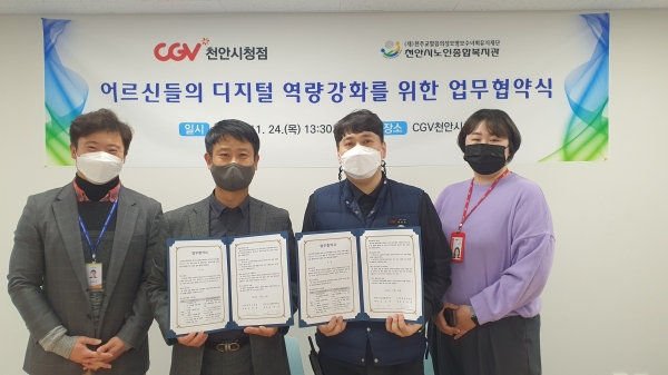 [Ytv영상스토리] 천안시노인종합복지관과 CGV천안시청점은 지난 24일 어르신 디지털 역량 강화와 문화 활동 지원을 위한 업무협약을 체결했다.