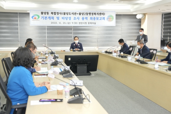 시는 2026년 하반기 준공을 목표로 지방재정법에 따른 불당동 복합청사 건립 기본계획 타당성 조사를 2023년 1월 한국지방행정연구원에 의뢰할 예정이며 2023년 내 지방재정투자심사를 마치고 공공건축 심의 및 설계 공모를 통한 실시설계 등을 순차적으로 추진할 계획이라고 전했다.