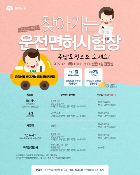 [Ytv영상스토리] 충남도는 도민 편의를 위해 다음달 1일 도청 민원실에서 ‘4분기 찾아가는 운전면허시험장’을 운영한다고 28일 밝혔다.
