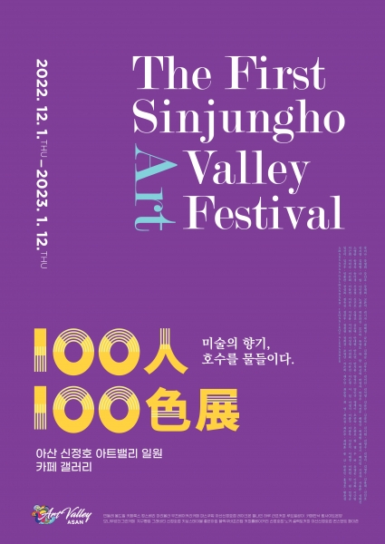 아산시는 12월 1일부터 2023년 1월 12일까지 43일간 신정호 일대 카페에서 ‘제1회 신정호 아트밸리 아트페스티벌: 100인 100색전’을 개최한다고 밝혔다.
